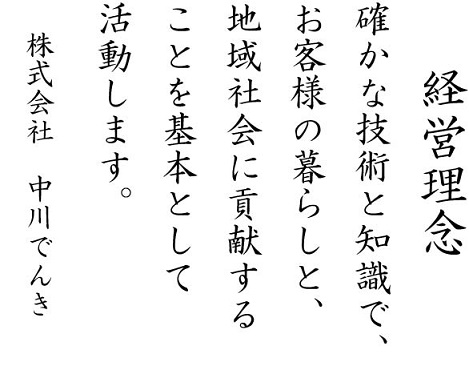 ・第二種電気工事士 ・給水装置工事主任技術者 ・ガス機器設置スペシャリスト ・家電製品総合アドバイザー ・中部電力住宅電化促進協会 オール電化推進認定店 ・パナソニック修理技術ゴールド認定店 ・省エネ型製品普及推進優良店 |